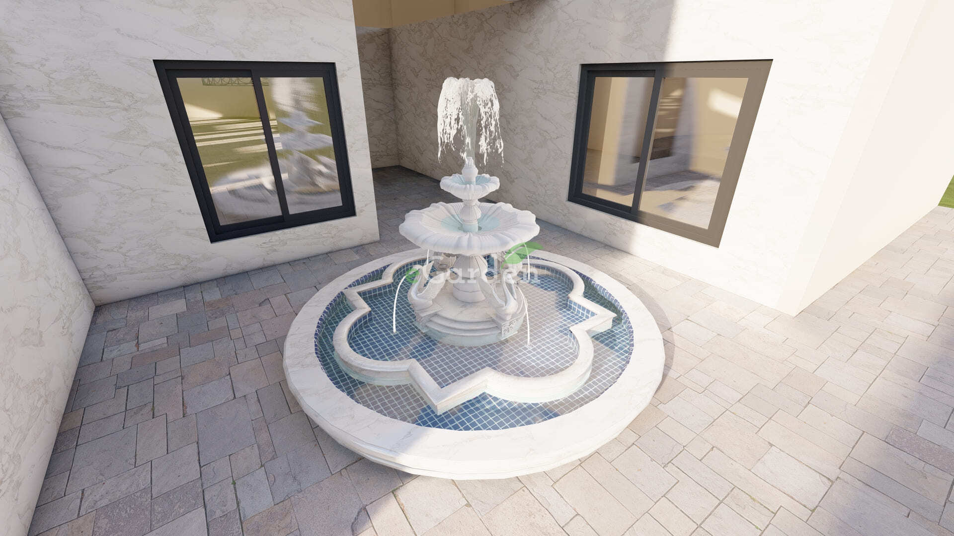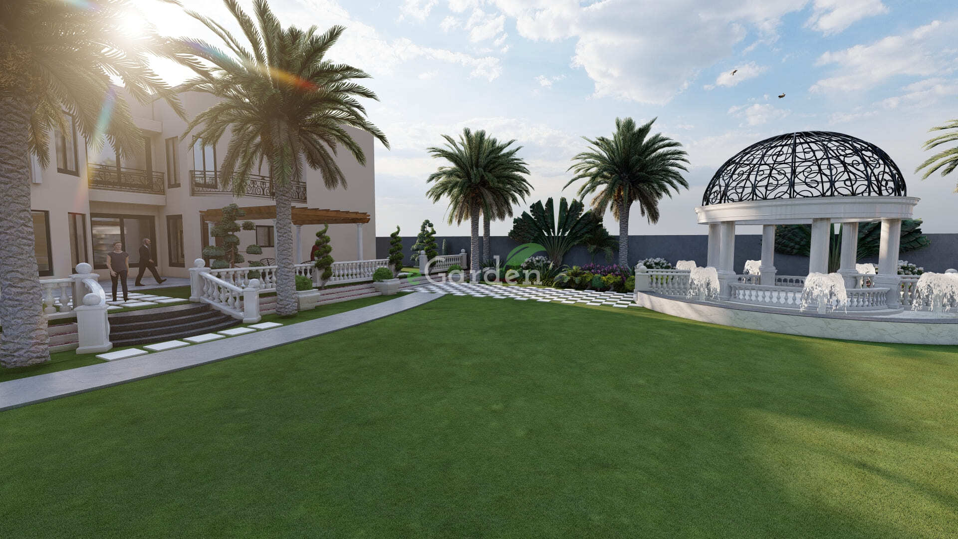 To make the lawn space more versatile and inviting, we added a cozy sitting area, perfect for relaxation or gatherings. Taking it a step further, a stunning waterfall gazebo was included, for calming sound and ambiance of water to the surroundings. This unique feature not only elevates the aesthetic appeal but also creates a peaceful retreat within the farmhouse.